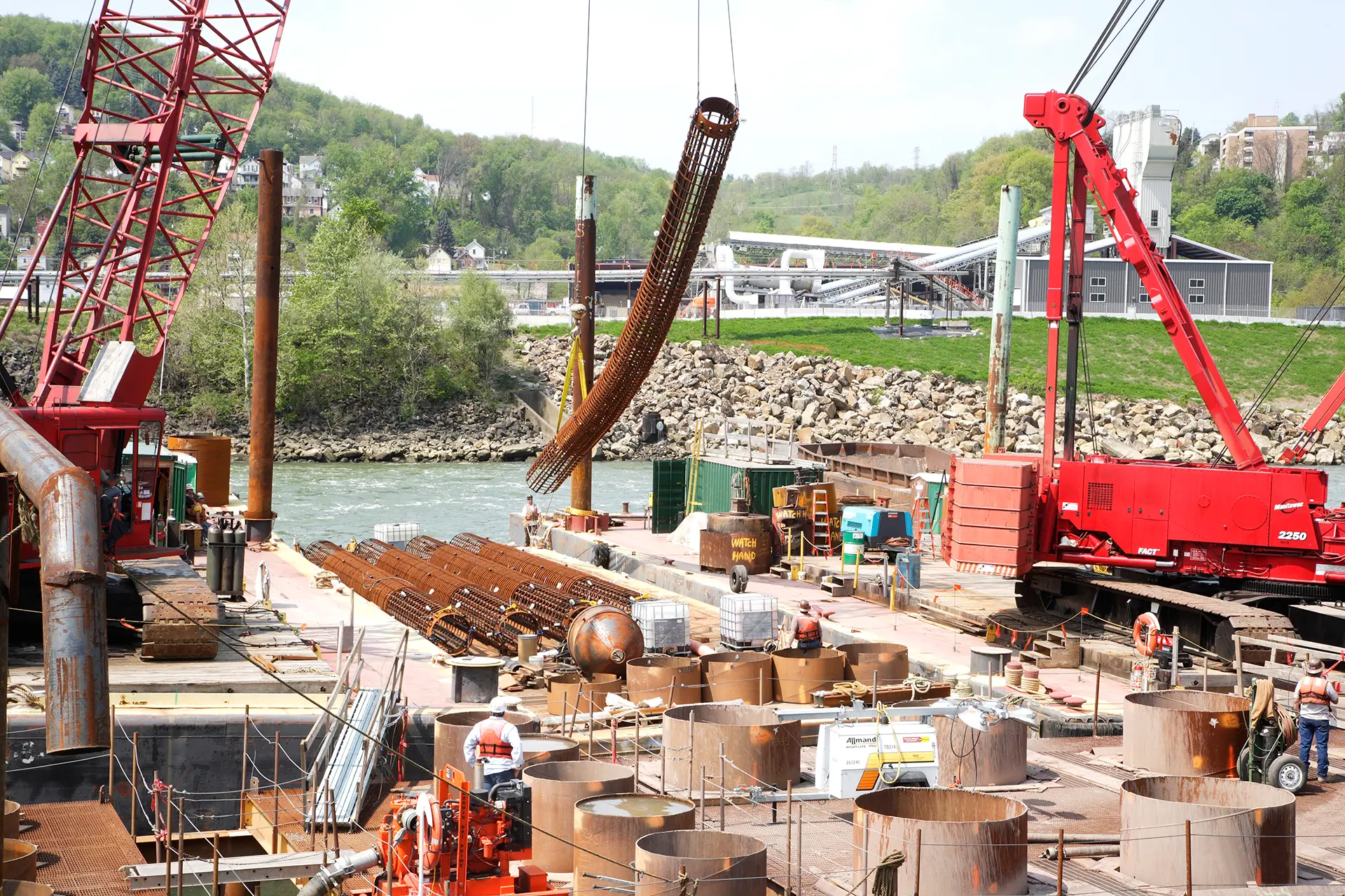 The new River Wall project is a component of a larger effort to improve and modernize the navigation facilities on the Lower Monongahela River between Braddock and Charleroi. The modernization effort at this site in Charleroi will ultimately result in the construction of two new 84-feet wide chambers to replace the existing 56-feet wide locks. The New River Wall portion of the work involved construction of an 884-feet long wall, with 459-feet on the upstream side of the dam and 425-feet on the downstream side, and is an extension of an existing stub wall. Performed as a joint venture by Trumbull Corporation and Brayman Construction Corporation, the work included a significant amount of “in-the -wet” construction techniques for the drilled shaft foundation system and concrete placements. Installation of 144-each drilled shafts was required to support the wall: 30-each 54-inch diameter and 114-each 78-inch diameter. All concrete placements for the drilled shafts were performed using underwater tremie placement techniques. The maximum concrete lifts were 15-feet and individually required three lifts. The top of each lift had to be cleaned by the diving team, prior to placement. Of the 21 new monoliths constructed to form the wall, 15 required “in-the-wet” techniques.