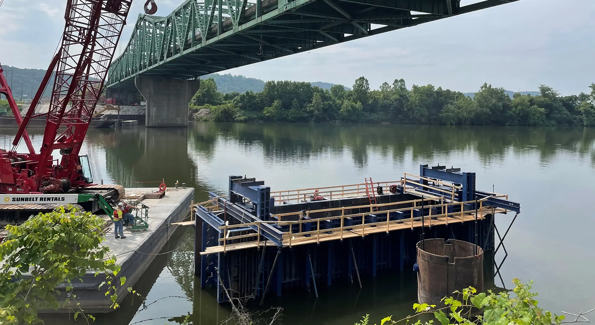 This project had a large marine component that required installing cofferdams and large-diameter drilled shafts in the river, as well as major steel components erected and installed from the water. Instead of traditional cofferdams, a custom submerged formwork system was devised in collaboration with Doka USA, allowing underwater construction of pier walls. This innovation greatly accelerated the schedule for the challenging river-related operations.
